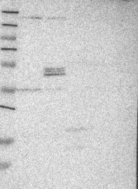 Band of predicted size in kDa (+/-20%) with additional bands present. Analysis performed using a standard panel of samples.
