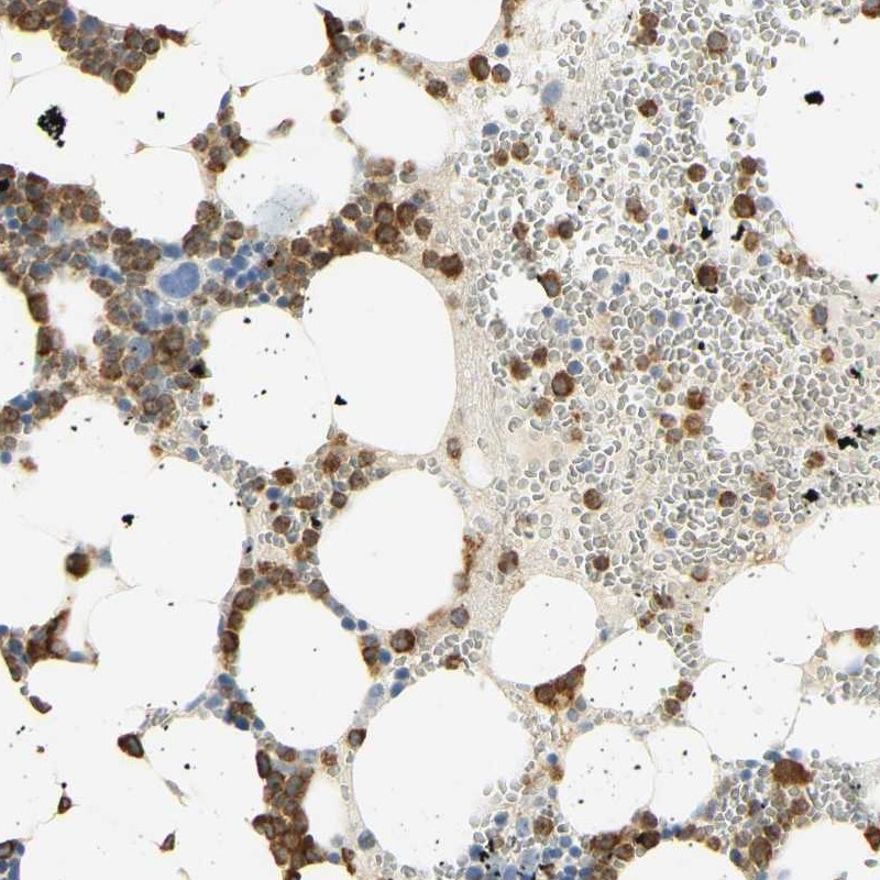 Immunohistochemical staining of human spleen shows strong nuclear and cytoplasmic positivity in red pulp cells.