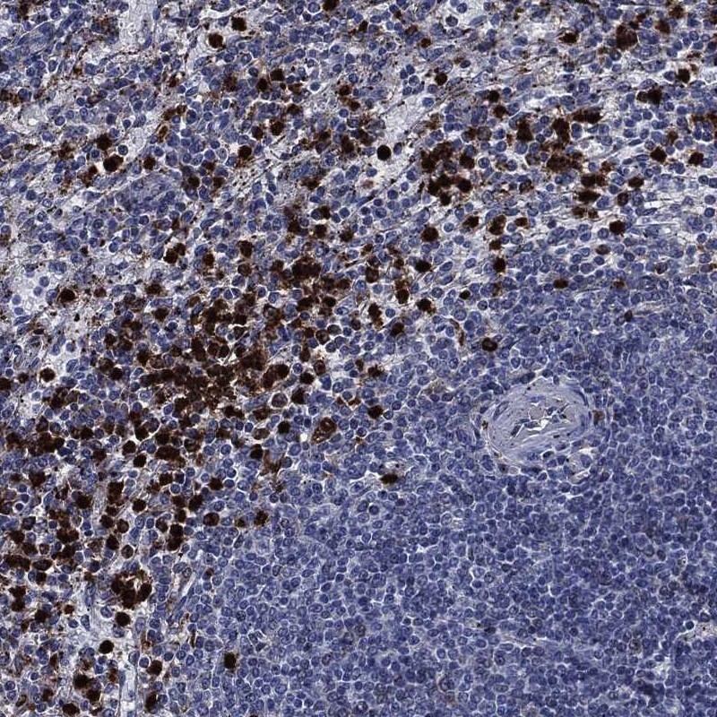 Immunohistochemical staining of human tonsil shows cytoplasmic positivity in germinal center cells.