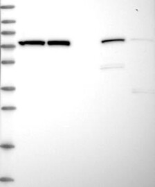 A Western blot analysis is performed on a panel of human tissues and cell lines to evaluate antibody specificity. For antibodies with unreliable result a revalidation using an over-expression lysate is performed.