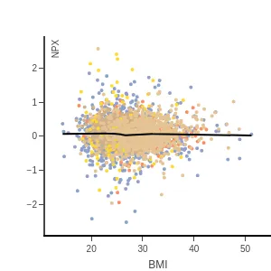 Blood protein levels by age, BMI, and sex, measured using the proximity extension assay (PEA) with the Olink Explore 1536. In the age and sex scatterplots, samples are colored by disease class, and details for each data point can be viewed by hovering.