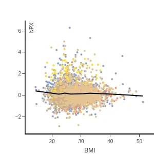 Blood protein levels by age, BMI, and sex, measured using the proximity extension assay (PEA) with the Olink Explore 1536. In the age and sex scatterplots, samples are colored by disease class, and details for each data point can be viewed by hovering.