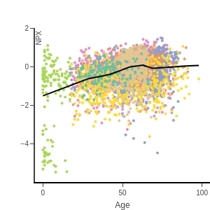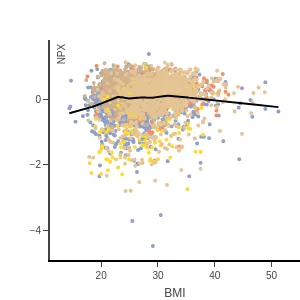Blood protein levels by age, BMI, and sex, measured using the proximity extension assay (PEA) with the Olink Explore 1536. In the age and sex scatterplots, samples are colored by disease class, and details for each data point can be viewed by hovering.