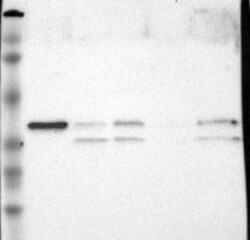 Band of predicted size in kDa (+/-20%) with additional bands present. Analysis performed using a standard panel of samples.