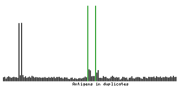 At the top of the view, the position of the antigen (identified by the corresponding HPA identifier) is shown as a green bar. A yellow triangle on the bar indicates a <100% sequence identity to the protein target.