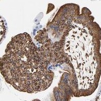 Immunohistochemical staining of human placenta shows strong cytoplasmic positivity in trophoblastic cells.