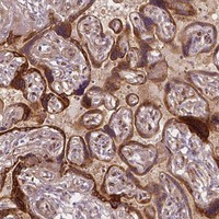 Immunohistochemical staining of human placenta shows membranous positivity in trophoblastic and endothelial cells.