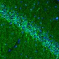 Typically, moderate-intensity neuronal cytoplasmic somatic- and weak diffuse-synaptic type immunostianing patterns are noticed throughout the entire brain. The cellular signal is more intense (strong) in a subpopulation of caudate putamen neurons, in the ventral pallidum, in a subpopulation of hippocampal neurons, in the cerebellar nuclei and in multiple brainstem nuclei. (Mouse brain)
