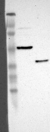 Band of predicted size in kDa (+/-20%) with additional bands present. Analysis performed using a standard panel of samples.
