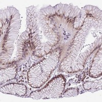 Immunohistochemical staining of human stomach, lower shows moderate nuclear and cytoplasmic positivity in glandular cells.