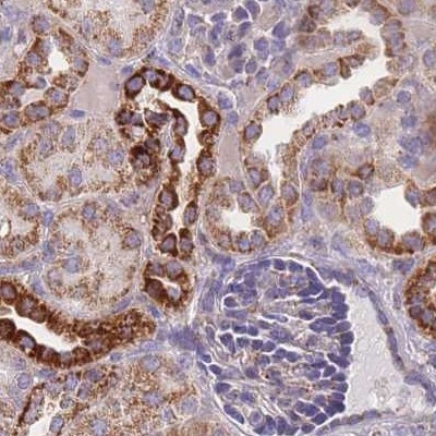 Immunofluorescent staining of human cell line U2OS shows localization to mitochondria.