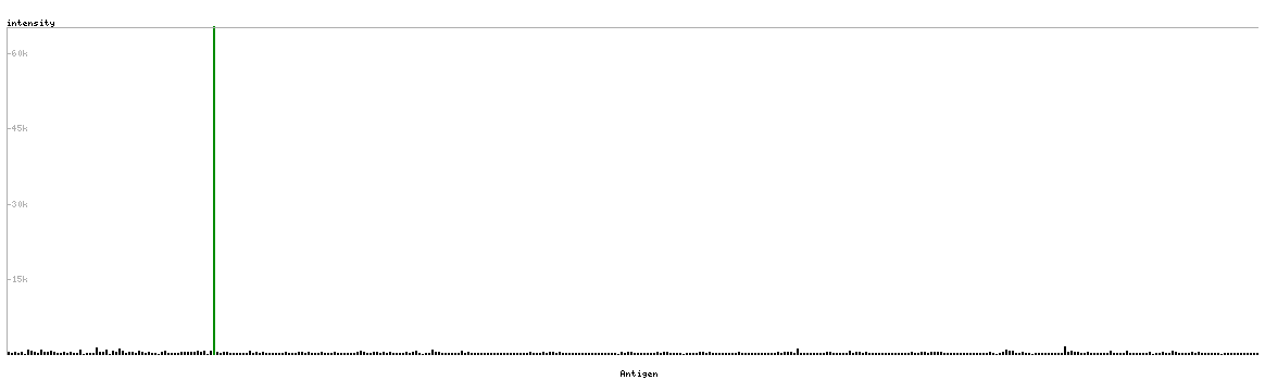 At the top of the view, the position of the antigen (identified by the corresponding HPA identifier) is shown as a green bar. A yellow triangle on the bar indicates a <100% sequence identity to the protein target.