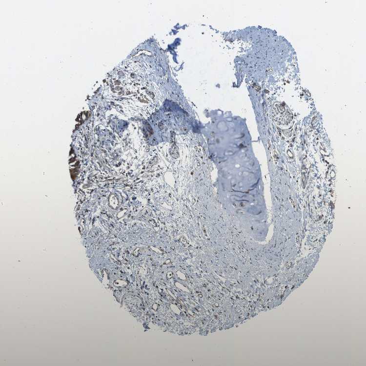 Antibody staining in the annotated cell types in the current human tissue is reported as not detected, low, medium, or high, based on conventional immunohistochemistry profiling in selected tissues. This score is based on the combination of the staining intensity and fraction of stained cells.