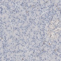 Immunohistochemical staining of human pancreas shows distinct cytoplasmic positivity in exocrine glandular cells.