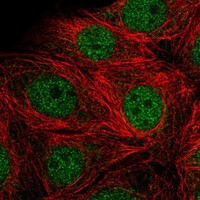 Immunofluorescent staining of human cell line MCF-7 shows localization to nucleoplasm. Protein location across all samples similar between independent antibodies
