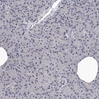 Immunohistochemical staining of human liver shows moderate cytoplasmic and nuclear positivity in hepatocytes.