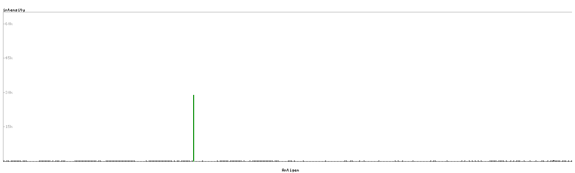 At the top of the view, the position of the antigen (identified by the corresponding HPA identifier) is shown as a green bar. A yellow triangle on the bar indicates a <100% sequence identity to the protein target.