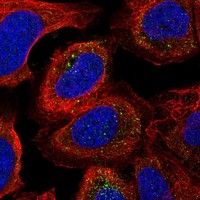 Enhanced validation is performed using either siRNA knockdown, tagged GFP cell lines or independent antibodies. For the siRNA validation the decrease in antibody-based staining intensity upon target protein downregulation is evaluated. For the GFP validation the signal overlap between the antibody staining and the GFP-tagged protein is evaluated. For the independent antibodies validation the evaluation is based on comparison of the staining of two (or more) independent antibodies directed towards independent epitopes on the protein.