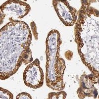 Immunohistochemical staining of human placenta shows distinct membranous and cytoplasmic positivity in trophoblastic cells.