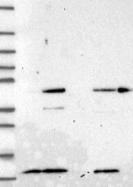 A Western blot analysis is performed on a panel of human tissues and cell lines to evaluate antibody specificity. For antibodies with unreliable result a revalidation using an over-expression lysate is performed.