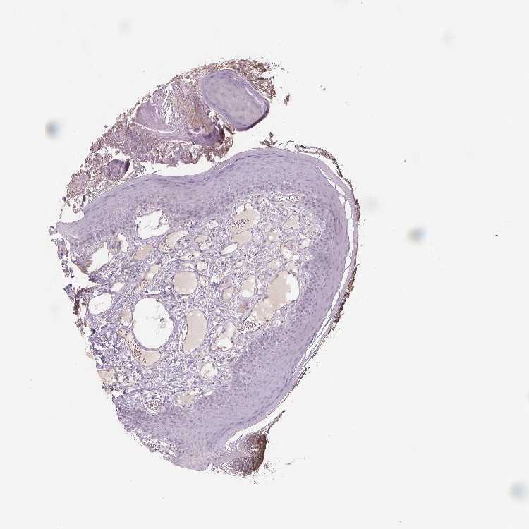 Antibody staining in the annotated cell types in the current human tissue is reported as not detected, low, medium, or high, based on conventional immunohistochemistry profiling in selected tissues. This score is based on the combination of the staining intensity and fraction of stained cells.