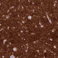 Immunohistochemical staining of human caudate shows strong positivity in neuropil.