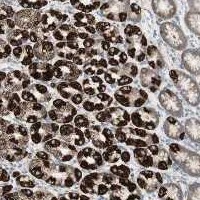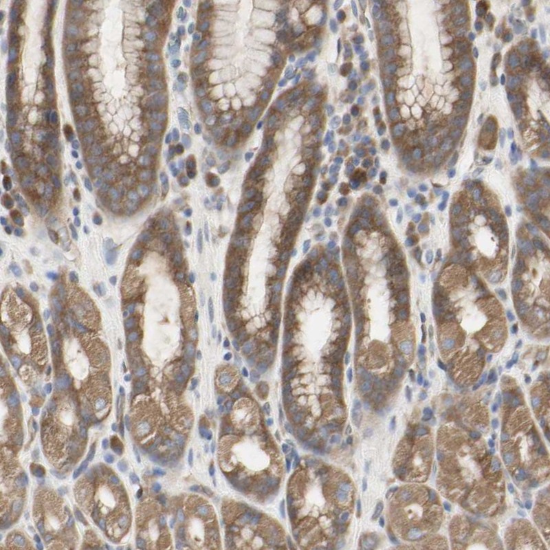 Immunohistochemical staining of human stomach shows strong cytoplasmic positivity in granular pattern in glandular cells.