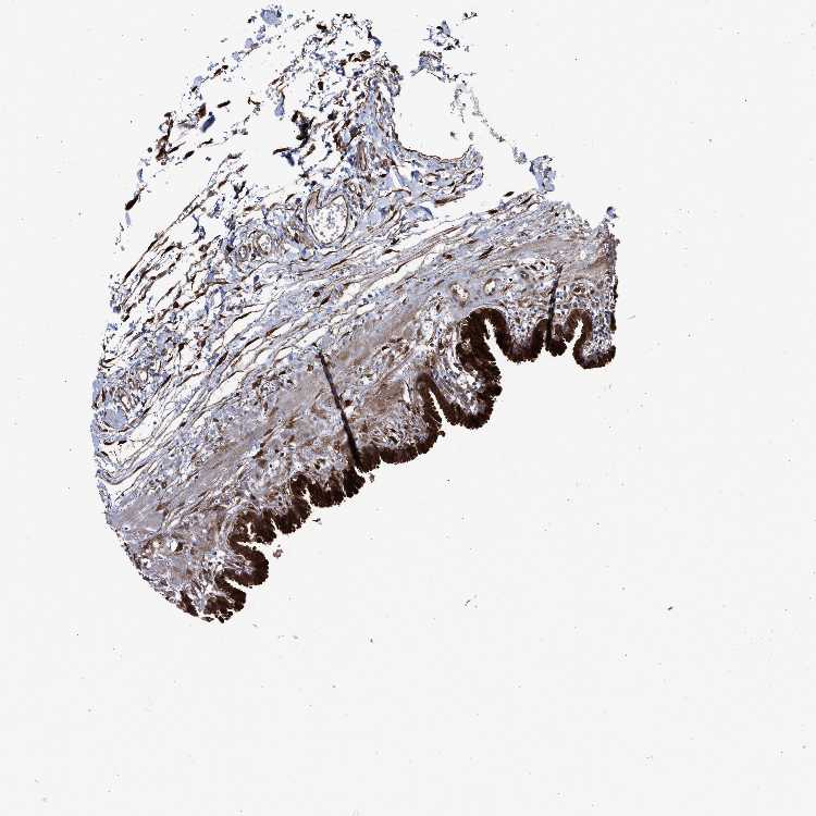 Antibody staining in the annotated cell types in the current human tissue is reported as not detected, low, medium, or high, based on conventional immunohistochemistry profiling in selected tissues. This score is based on the combination of the staining intensity and fraction of stained cells.
