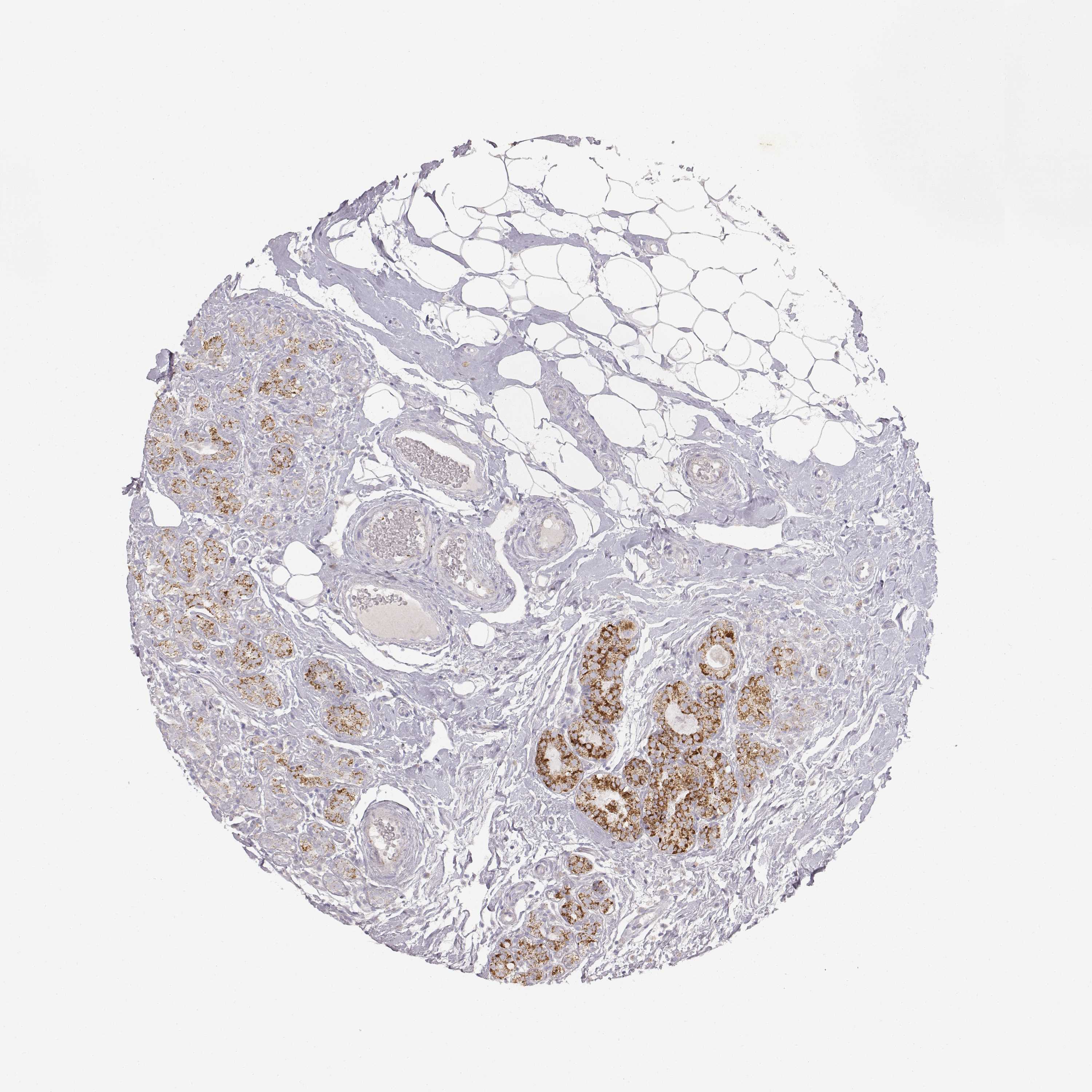 Antibody staining in the annotated cell types in the current human tissue is reported as not detected, low, medium, or high, based on conventional immunohistochemistry profiling in selected tissues. This score is based on the combination of the staining intensity and fraction of stained cells.