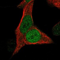 Assay for determining the subcellular location of the encoded protein(s) in human cells by indirect immunofluorescence and confocal microscopy. The antibody-based staining is generally carried out in U2OS and two additional cell lines, selected based on RNA expression. Representative multi-color images showing the protein of interest in green are displayed below. The images also include markers for the nucleus (blue), microtubules (red) and ER (yellow). All images are clickable for an enlarged view. For cell structure reference, visit the cell dictionary.