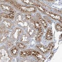 Immunohistochemical staining of human kidney shows moderate membranous positivity in cells in tubules.