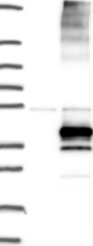 Band of predicted size in kDa (+/-20%) with additional bands present.