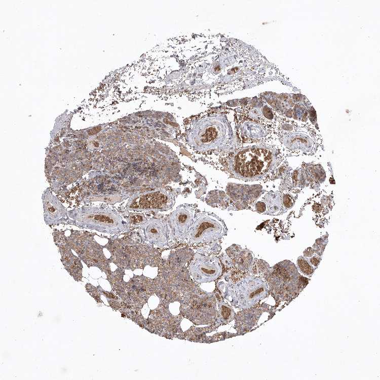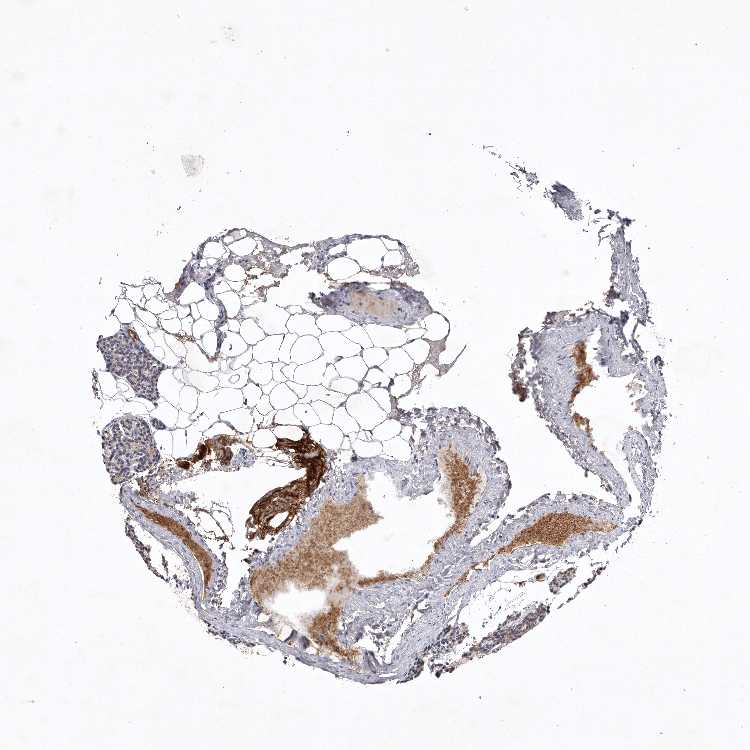 Antibody staining in the annotated cell types in the current human tissue is reported as not detected, low, medium, or high, based on conventional immunohistochemistry profiling in selected tissues. This score is based on the combination of the staining intensity and fraction of stained cells.