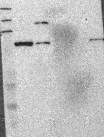 Band of predicted size in kDa (+/-20%) with additional bands present. Analysis performed using a standard panel of samples.