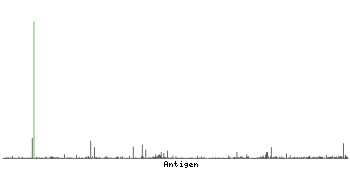 At the top of the view, the position of the antigen (identified by the corresponding HPA identifier) is shown as a green bar. A yellow triangle on the bar indicates a <100% sequence identity to the protein target.