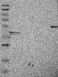 Single band larger than predicted size in kDa (+20%) but partly supported by experimental and/or bioinformatic data. Analysis performed using a standard panel of samples.