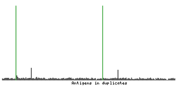 At the top of the view, the position of the antigen (identified by the corresponding HPA identifier) is shown as a green bar. A yellow triangle on the bar indicates a <100% sequence identity to the protein target.
