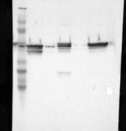 Band of predicted size in kDa (+/-20%) with additional bands present. Analysis performed using a standard panel of samples.