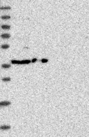 A Western blot analysis is performed on a panel of human tissues and cell lines to evaluate antibody specificity. For antibodies with unreliable result a revalidation using an over-expression lysate is performed.