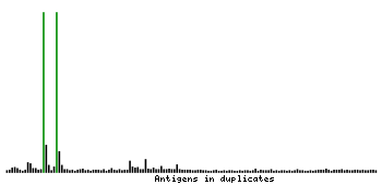 At the top of the view, the position of the antigen (identified by the corresponding HPA identifier) is shown as a green bar. A yellow triangle on the bar indicates a <100% sequence identity to the protein target.