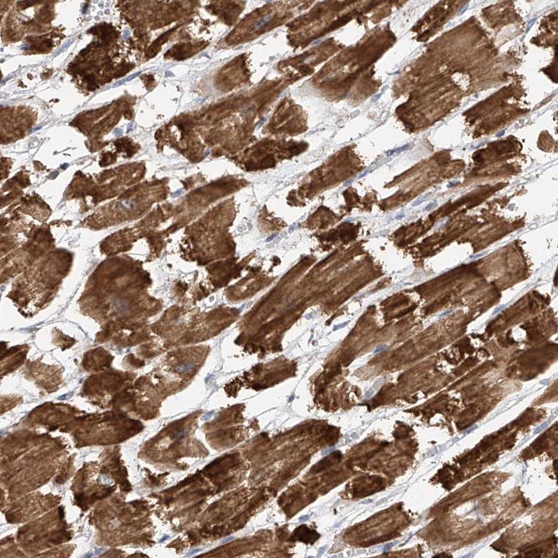 Immunohistochemical staining of human heart muscle shows strong cytoplasmic positivity in myocytes.