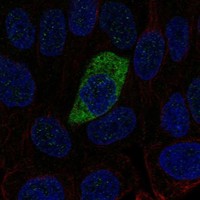 Enhanced validation is performed using either siRNA knockdown, tagged GFP cell lines or independent antibodies. For the siRNA validation the decrease in antibody-based staining intensity upon target protein downregulation is evaluated. For the GFP validation the signal overlap between the antibody staining and the GFP-tagged protein is evaluated. For the independent antibodies validation the evaluation is based on comparison of the staining of two (or more) independent antibodies directed towards independent epitopes on the protein.