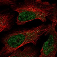 Immunofluorescent staining of human cell line U2OS shows localization to nucleoplasm and cytosol.