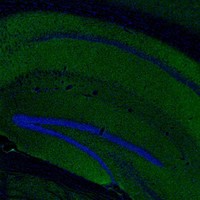 Moderate intensity diffuse-synaptic immunostaining throughout the entire brain virtually in all gray matter. No any staining is detected in any white matter. (Mouse brain)