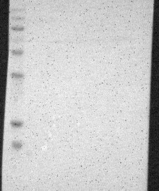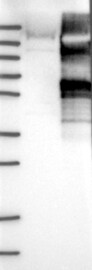 Band of predicted size in kDa (+/-20%) with additional bands present.