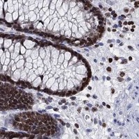 Immunofluorescent staining of human cell line PODO/TERT256 shows localization to nucleoplasm.