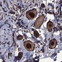 Immunohistochemical staining of human ovary shows nuclear positivity in oocytes.