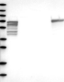 Band of predicted size in kDa (+/-20%) with additional bands present. Analysis performed using a standard panel of samples.