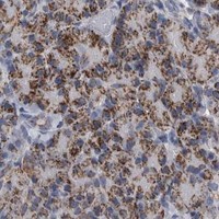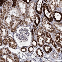 Immunofluorescent staining of human cell line A-431 shows localization to mitochondria.