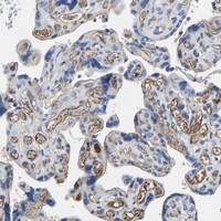 Immunohistochemical staining of human placenta shows strong positivity in endothelial cells and extracellular deposits.